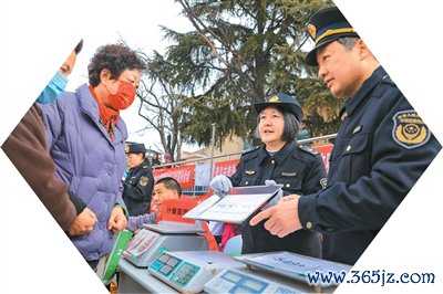 山东省青岛市李沧区台柳路社区,市集监督责任主说念主员向市民宣传电子秤计量学问。 张 鹰摄(东说念主民视觉)